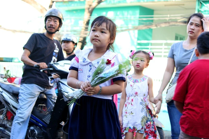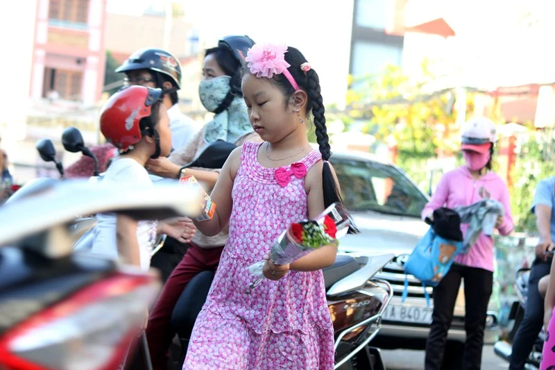 Em nhỏ cầm bông hoa trên tay cẩn thận suốt giờ làm lễ. Ảnh chụp tại Trường Tiểu học Trần Khánh Dư (quận 1) sáng 20-11. Ảnh: HOÀNG GIANG