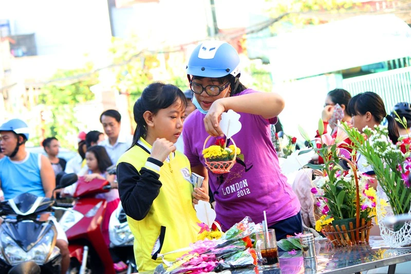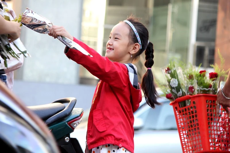 Vui mừng vì chọn được bông hoa mà cô giáo thích. Ảnh chụp tại Trường Tiểu học Hoàng Văn Thụ (quận Tân Bình) sáng 20-11. Ảnh: HOÀNG GIANG