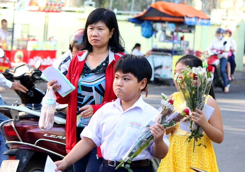 Cũng trong sáng 20-11, nhiều phụ huynh đưa con đến trường và giúp con lựa chọn hoa tặng thầy cô. Ảnh chụp tại Trường Tiểu học Hoàng Văn Thụ (quận Tân Bình) sáng 20-11. Ảnh: HOÀNG GIANG