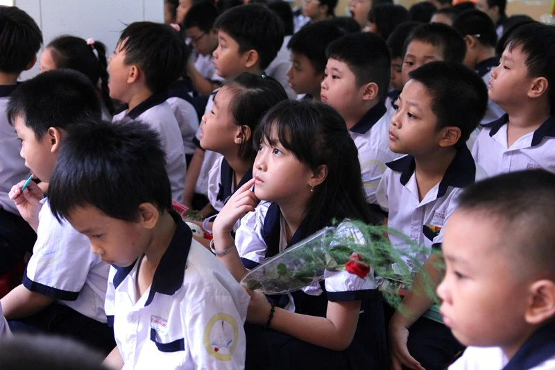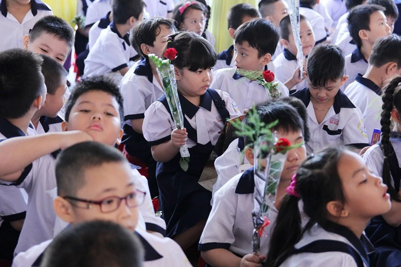 Học sinh háo hức chờ tặng hoa thầy cô. Ảnh chụp tại Trường Tiểu học Trần Khánh Dư (quận 1) sáng 20-11. Ảnh: HOÀNG GIANG