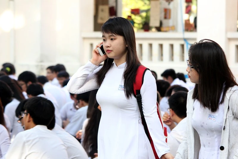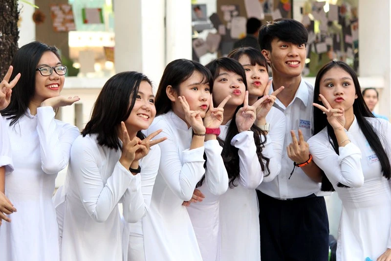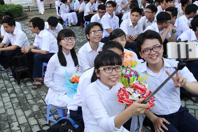 Các bạn học sinh Trường THPT chuyên Lê Hồng Phong tranh thủ tạo hình chụp ảnh trong không khí tràn ngập niềm vui. Ảnh: HOÀNG GIANG