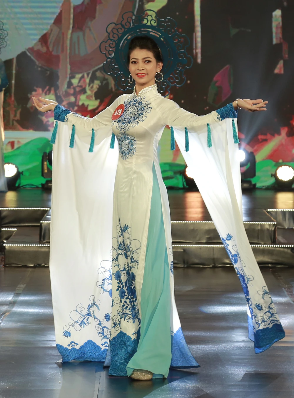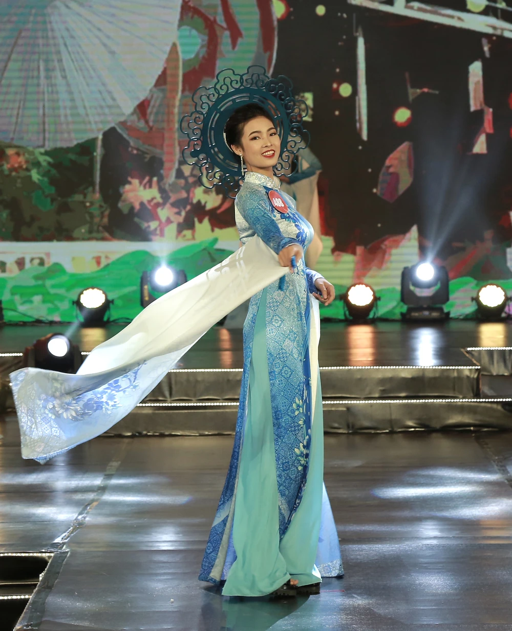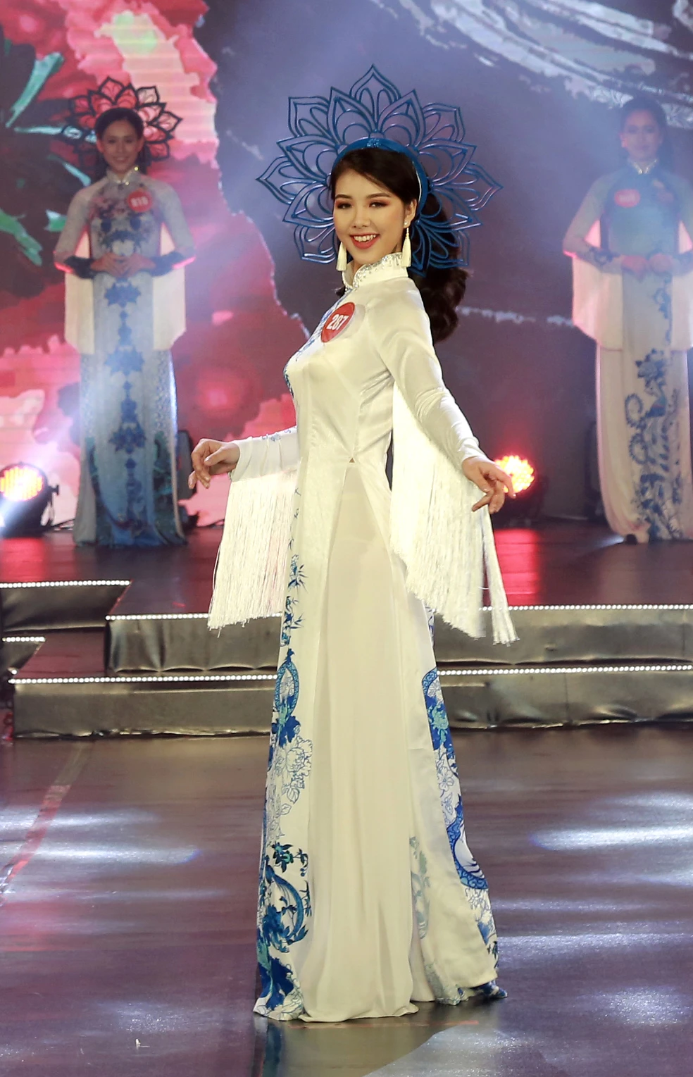 Các thí sinh rạng rỡ trong phần thi trang phục áo dài.
