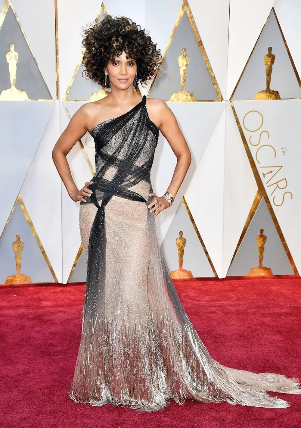 Halle Berry từng được Nữ diễn viên chính xuất sắc nhất phim Monster's Ball, cô diện đầm Versace.