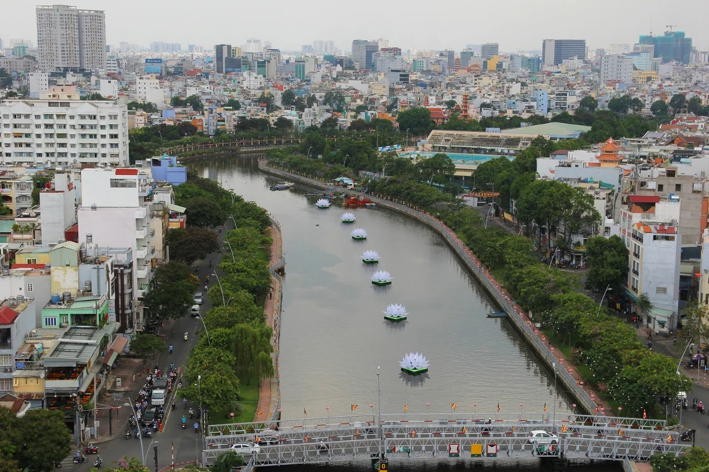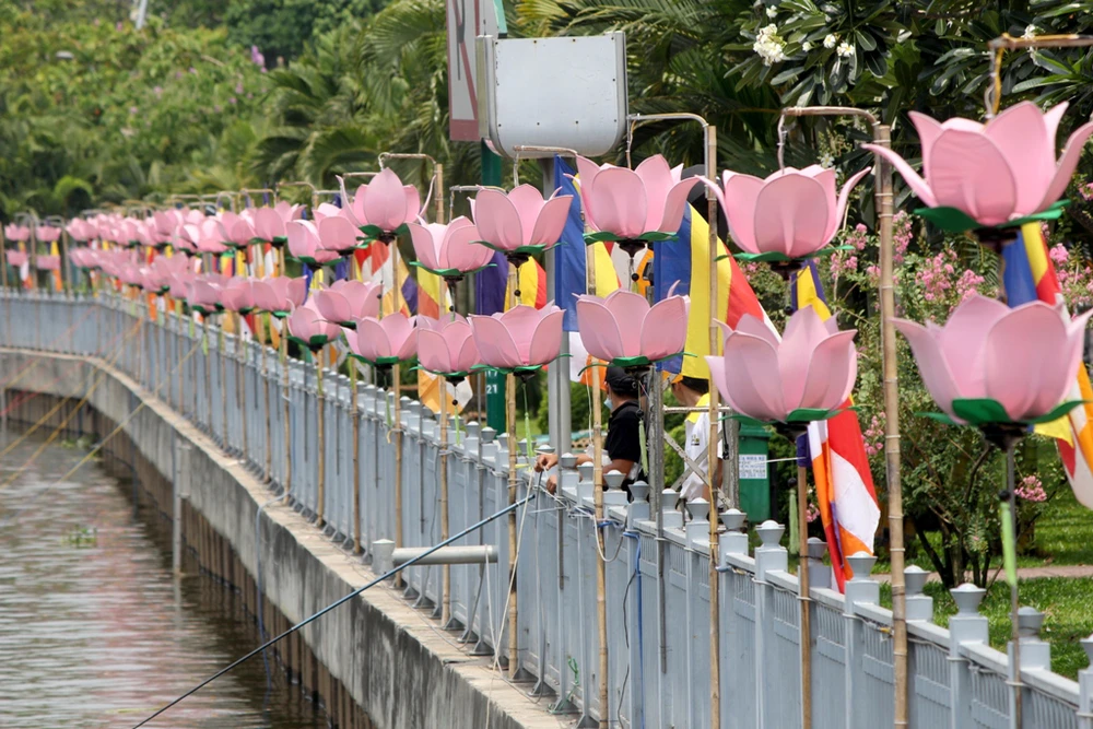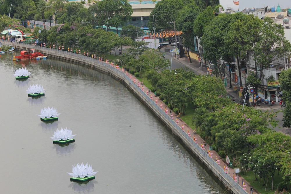 Cờ hoa chào mừng lễ Phật đản được cắm dọc hai bên kênh Nhiêu Lộc.