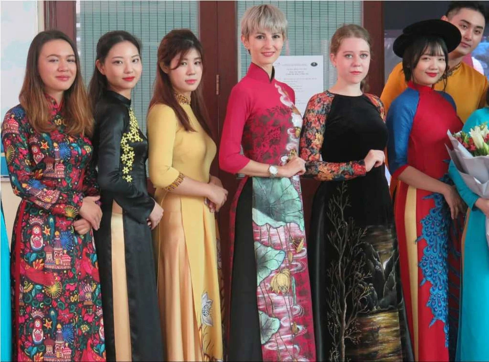 Những snh viên nước ngoài tươi tắn, xinh đẹp trong tà áo dài Việt Nam. Ảnh: PA