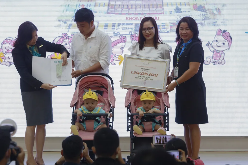 Phòng Công tác xã hội Bệnh viện Nhi đồng Thành phố trao quỹ tiết kiệm trị giá 1,5 tỉ đồng cho gia đình hai bé.