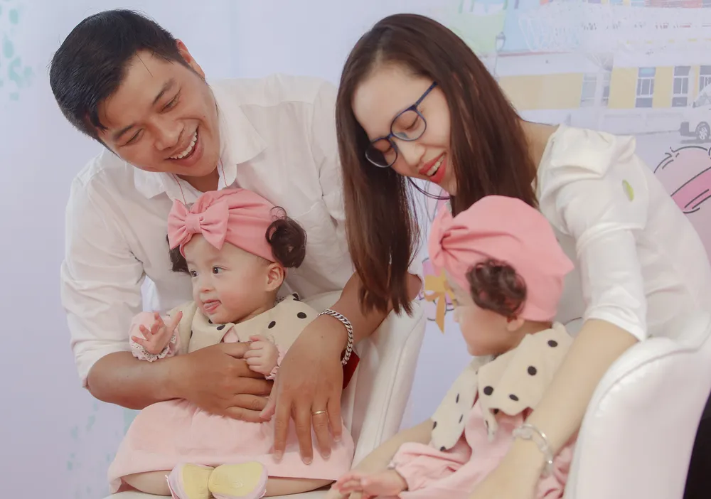 Cha mẹ hai bé vui mừng trong ngày hai con yêu xuất viện.