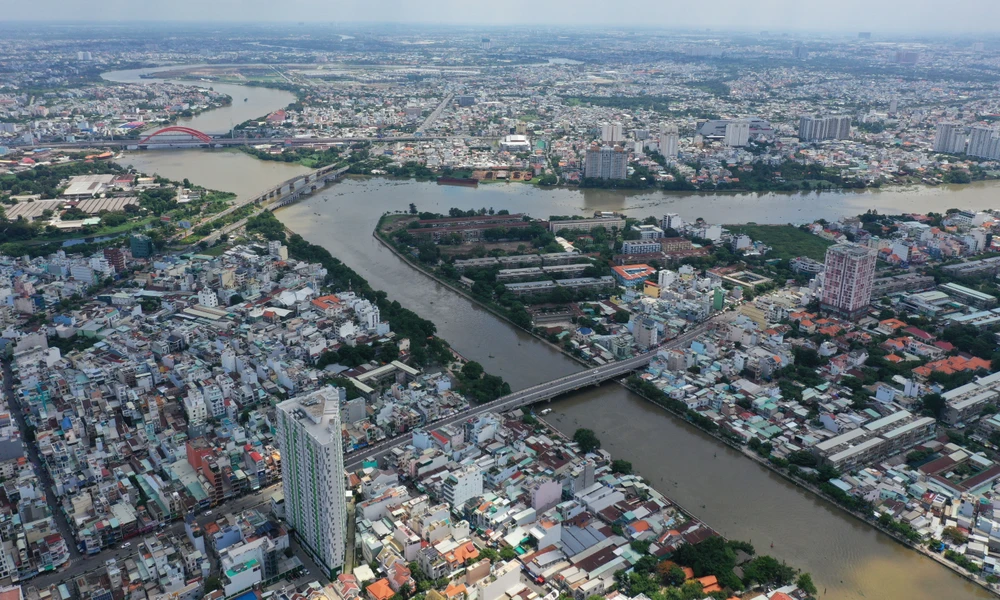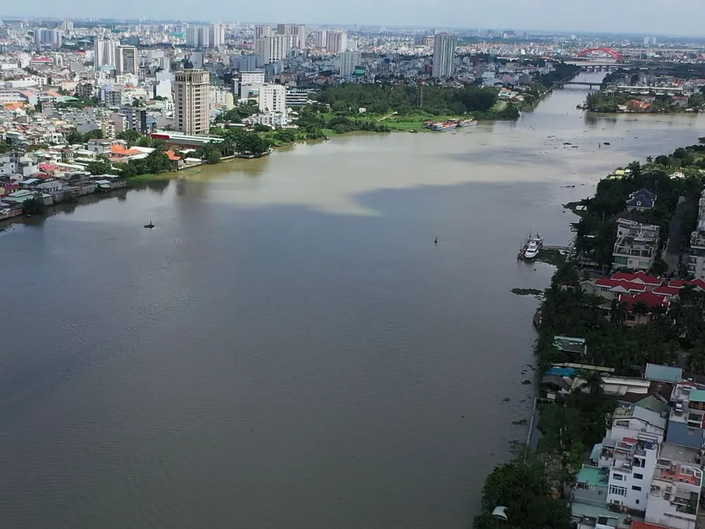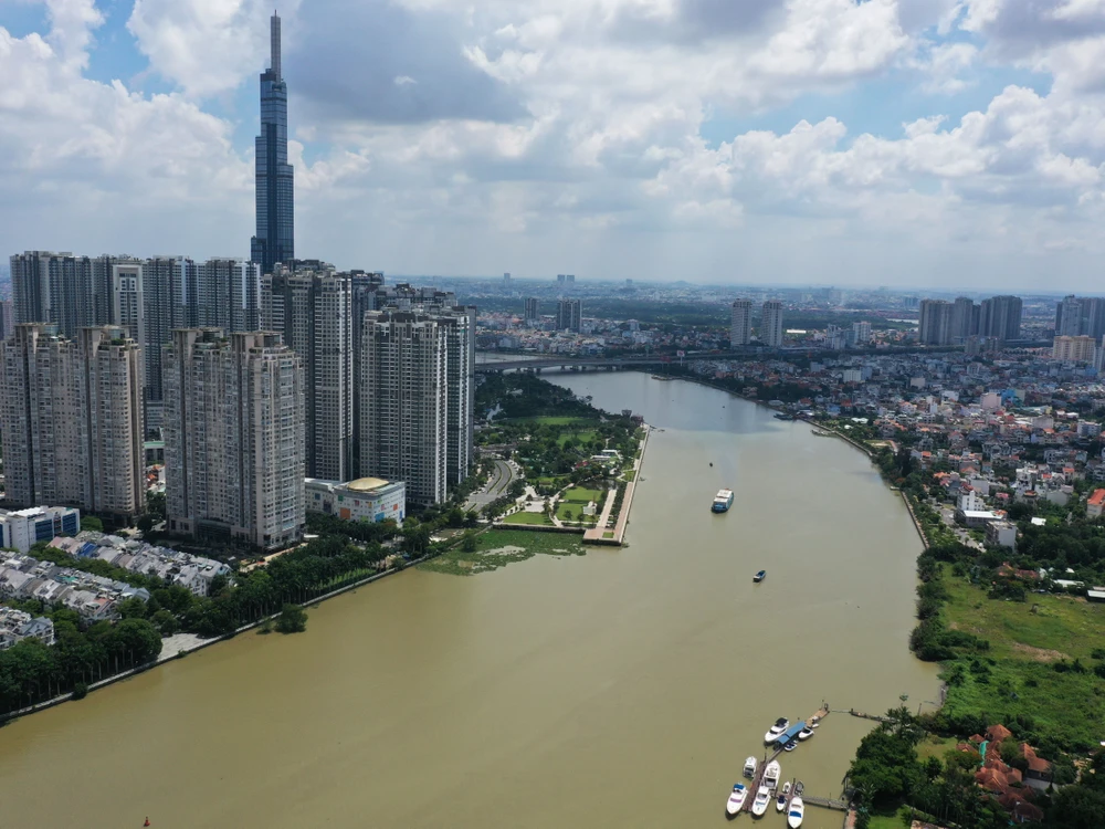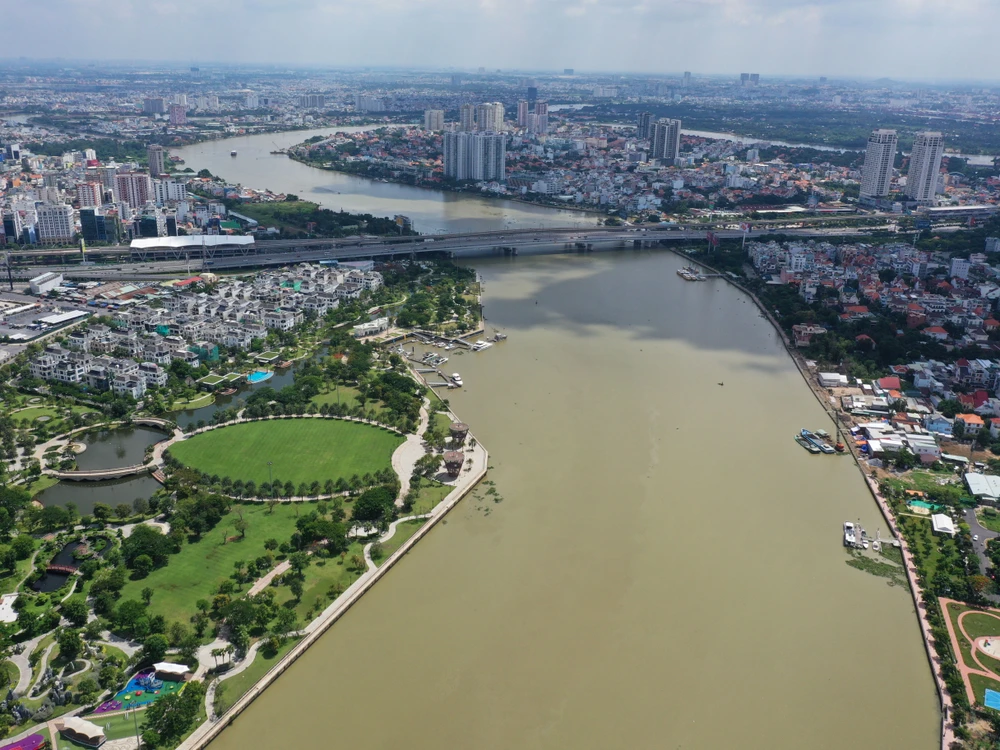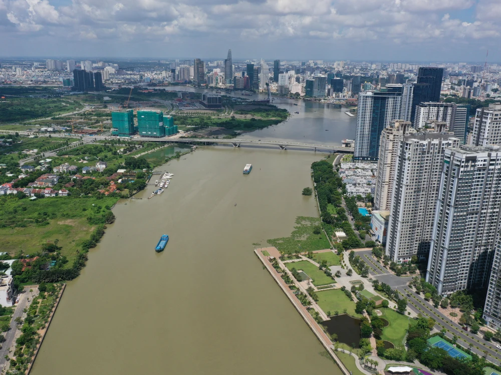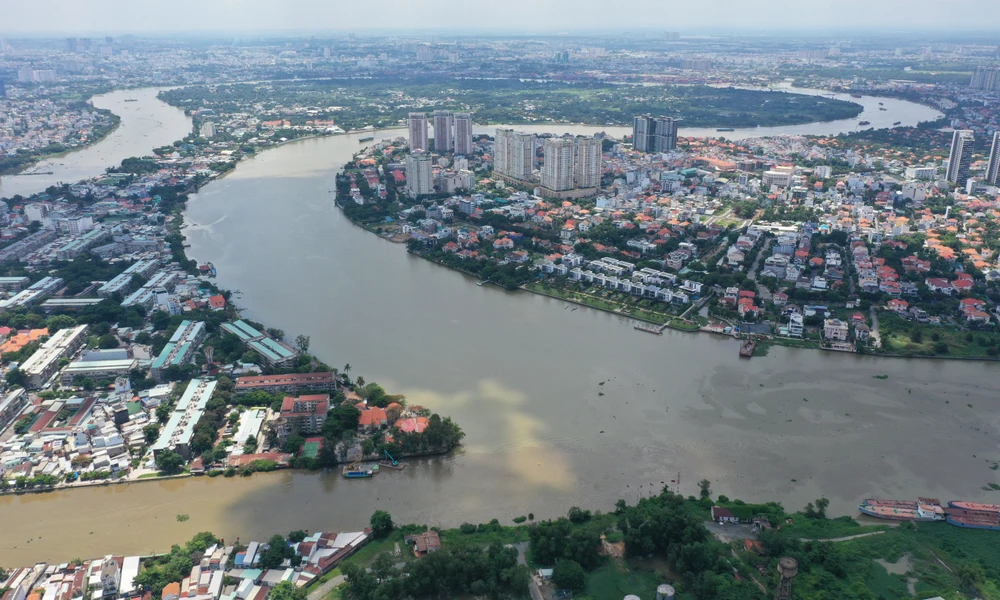 Sông Sài Gòn đoạn qua TP.HCM có chiều dài 80 km, chảy qua khu trung tâm TP và được xem là tài sản quý giá về đô thị sông nước ở Sài Gòn. Trong ảnh là đoạn chảy qua trung tâm TP, với một bên là quận Bình Thạnh và một bên là khu đô thị Thủ Thiêm.