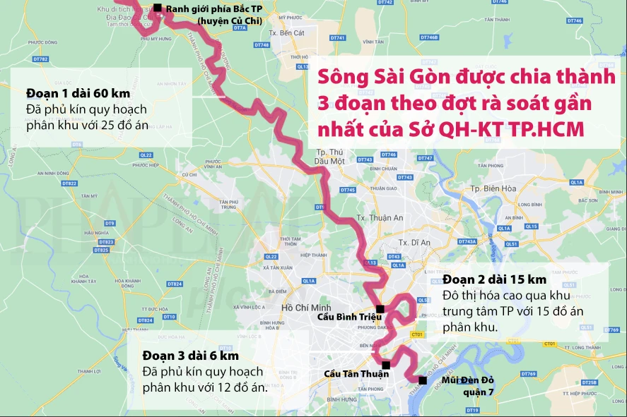 Trong lần rà soát quy hoạch gần nhất, Sở QH-KT TP.HCM cho biết sông Sài Gòn có thể chia làm 3 đoạn với hơn 50 quy hoạch phân khu được phủ kín. Ảnh đồ họa: THÙY TRANG