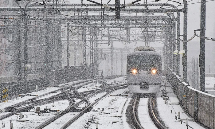 Đường ray tàu điện phủ trắng tuyết.