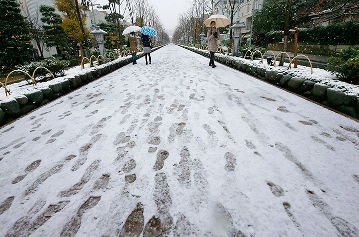 Tuyết rơi làm nhiệt độ ở đây xuống đột ngột, ai ai cũng phải mặc áo ấm khi ra đường.