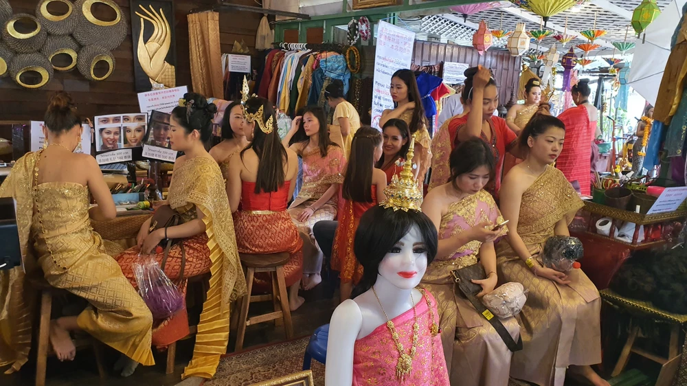 Nhiều người chọn gian hàng hóa trang để chụp ảnh trong những trang phục truyền thống của người Thái Lan.