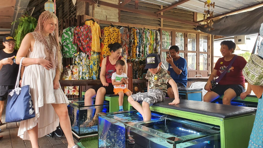 Dịch vụ cho cá rỉa chân thư giãn trong chợ. Ảnh: T.TÙNG