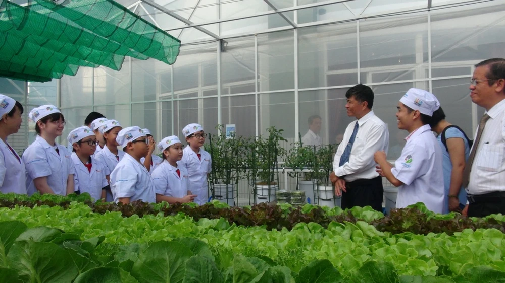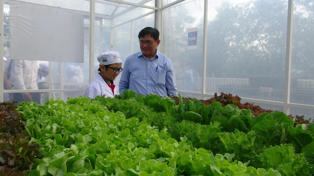 Ông Nguyễn Văn Hiếu (Phó Giám đốc Sở GD&ĐT TP.HCM) đứng nghe các em học sinh giới thiệu về mô hình trồng rau sạch trong nhà kính của trường.
