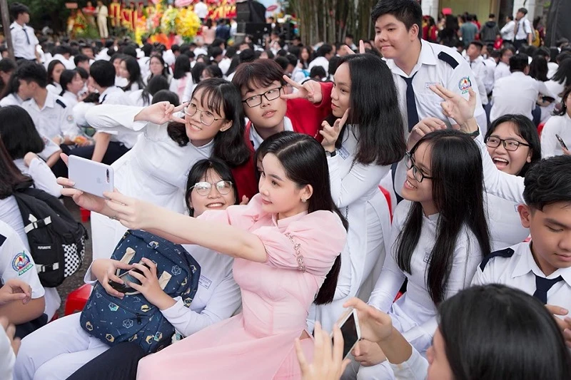 Trong những bức ảnh chụp cùng thầy cô giáo và học sinh Trường THPT Bùi Thị Xuân, Ngân Anh khoe nhan sắc trẻ trung và tươi tắn như nữ sinh trung học. Đây cũng là ngôi trường cô đã từng theo học.