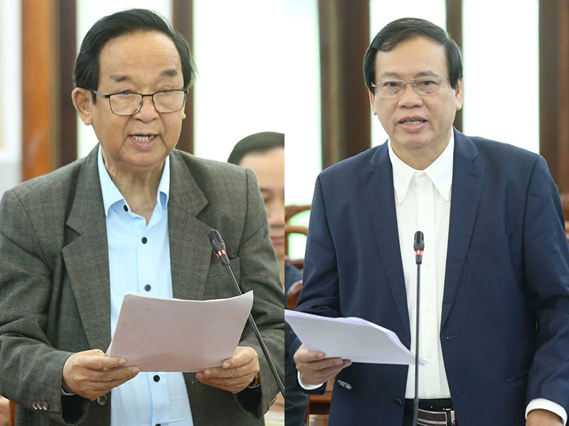 GS Nguyễn Lân Dũng và ông Vũ Trọng Kim, nguyên Phó Chủ tịch Ủy ban Trung ương MTTQ Việt Nam, nêu nhiều ý kiến thẳng thắn tại hội nghị. Ảnh: CHÂN LUẬN