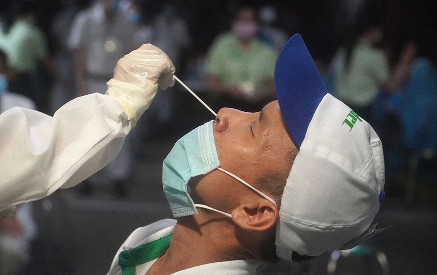 Lấy mẫu xét nghiệm COVID-19 cho công nhân tại một công ty ở Khu chế xuất Tân Thuận, quận 7, TP.HCM vào tối 2-6. Ảnh: MINH TÂM