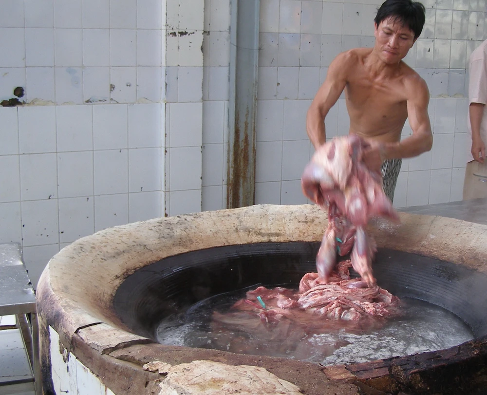 Thịt bò bơm nước đang được luộc. Ảnh: TRẦN NGỌC