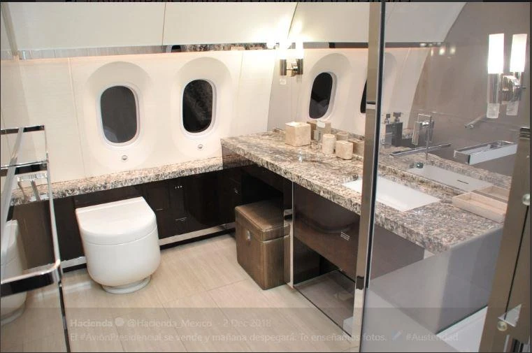 Chiếc máy bay 787 Dreamliner này bao gồm các tiện nghi sang trọng như phòng tổng thống rộng rãi, bảy phòng họp với ghế bọc da cao cấp cho hơn 250 người và phòng tắm lót đá cẩm thạch.