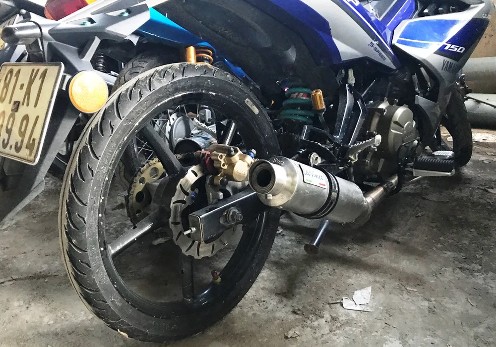 Một xe Exciter được gắn bánh nhỏ và pô "độ". Ảnh: HẢI HIẾU