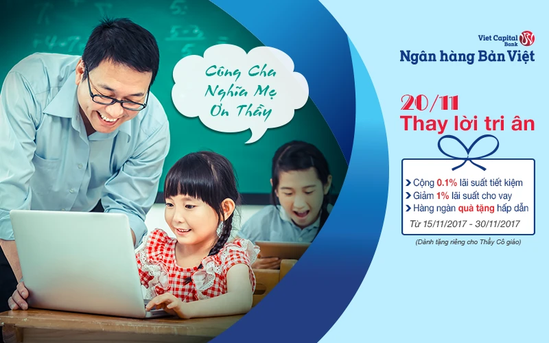 Nhân dịp ngày Nhà giáo Việt Nam 20-11, Ngân hàng Bản Việt xin gửi tới đến quý thầy cô giáo - những người đã và đang nỗ lực hết mình trong sự nghiệp trồng người những lời chúc tốt đẹp. Và thay cho tấm lòng tri ân sâu sắc, từ 15-11 đến ngày 30-11, Ngân hàng Bản Việt triển khai chương trình “Thay lời tri ân” với những phần quà ý nghĩa và thiết thực dành riêng cho quý thầy cô giáo trên cả nước.