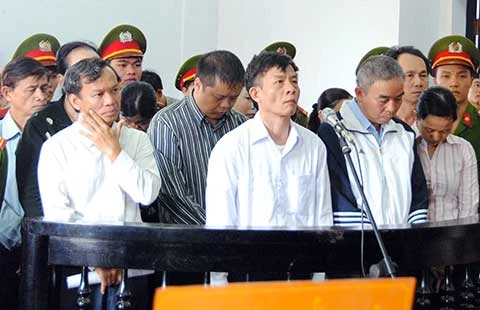Nguyên giám đốc VDB Đắk Lắk - Đắk Nông Vũ Việt Hùng (áo trắng, giữa) và các bị cáo khác tại phiên tòa sơ thẩm hồi tháng 3-2014. Ảnh: NLĐ