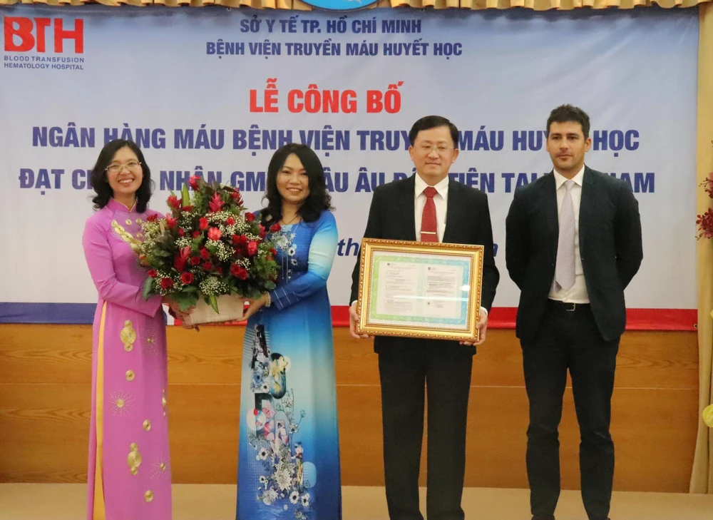 Ngày 5-4, BV Truyền máu huyết học TP.HCM đã tổ chức lễ công bố ngân hàng máu của bệnh viện chính thức được cấp chứng nhận đạt tiêu chuẩn thực hành sản xuất tốt chuẩn châu Âu (European GMP). BV là đơn vị đầu tiên của Việt Nam đạt chứng nhận này.