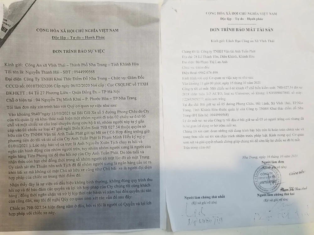 Đại diện chủ bãi xe cũng có đơn trình báo sự việc rằng lúc 9 giờ 40 ngày 15-10, một nhóm người đi trên hai ô tô và xe cẩu xưng là thuộc Ngân hàng TPBank đi cùng với một trung úy công an mặc sắc phục và thông báo đến thu hồi nợ. Nhóm người đã tự ý cẩu xe khách biển số 79B- 027… thuộc sở hữu của Công ty TNHH Vận tải Anh Tuấn Phát đang đậu tại đây mà không có sự chứng kiến của chủ xe hoặc người đại diện bãi xe.