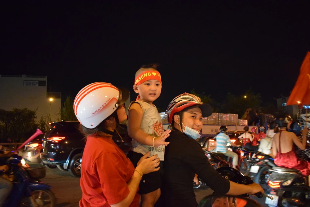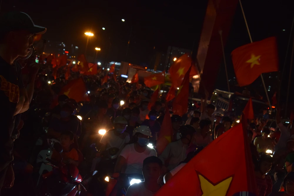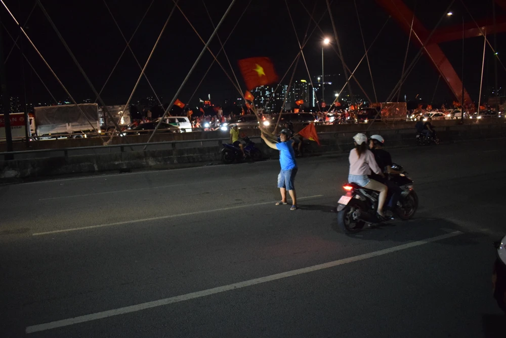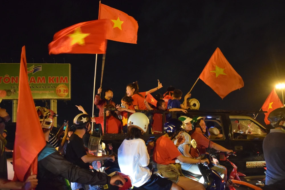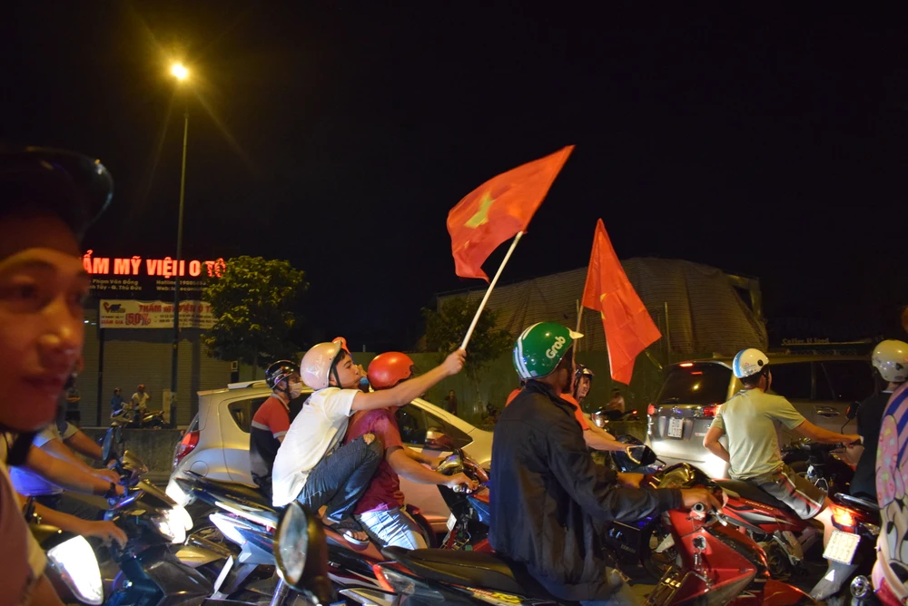 Cờ đỏ sao vàng phủ khắp con đường. Người hâm mộ ùn ùn đi bão mừng chiến thắng của đội tuyển bóng đá Việt Nam trong trận bán kết lượt về.