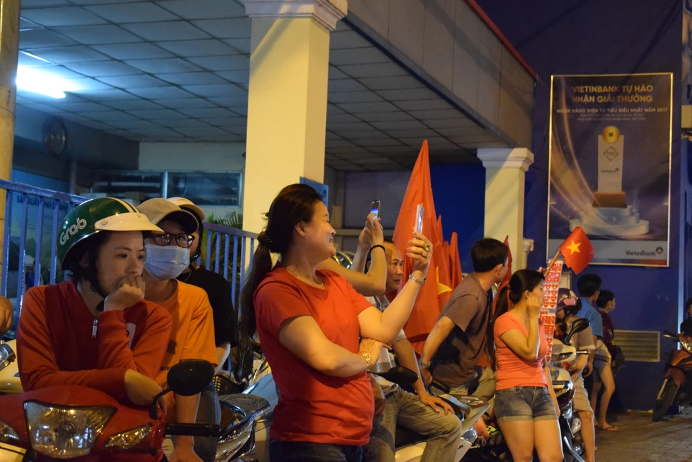 Những người đứng ven đường ghi lại khoảnh khắc sôi động của người hâm mộ bóng đá Việt Nam.