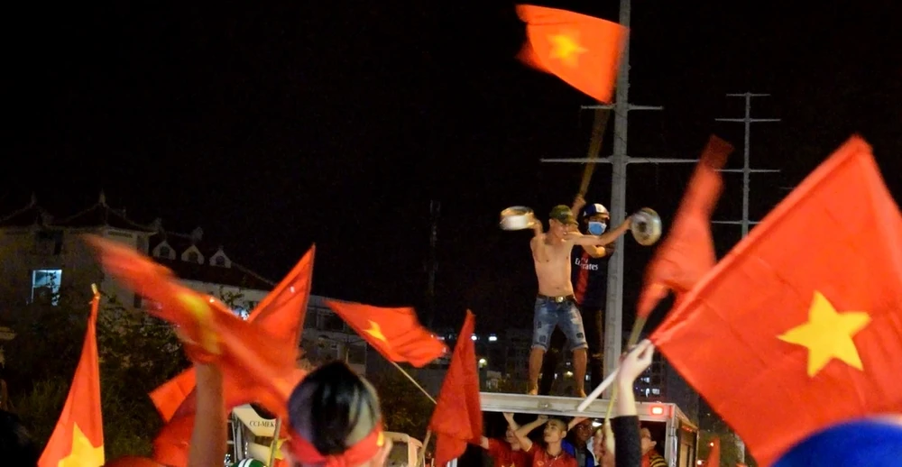 Thanh niên lao thẳng ra đường múa cờ mừng đội tuyển Việt Nam chiến thắng.
