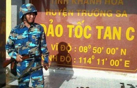 Trung úy Phan Văn Hạnh trong một ca gác tại đảo Tốc Tan C. Ảnh: TÂN HỮU