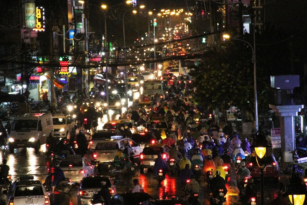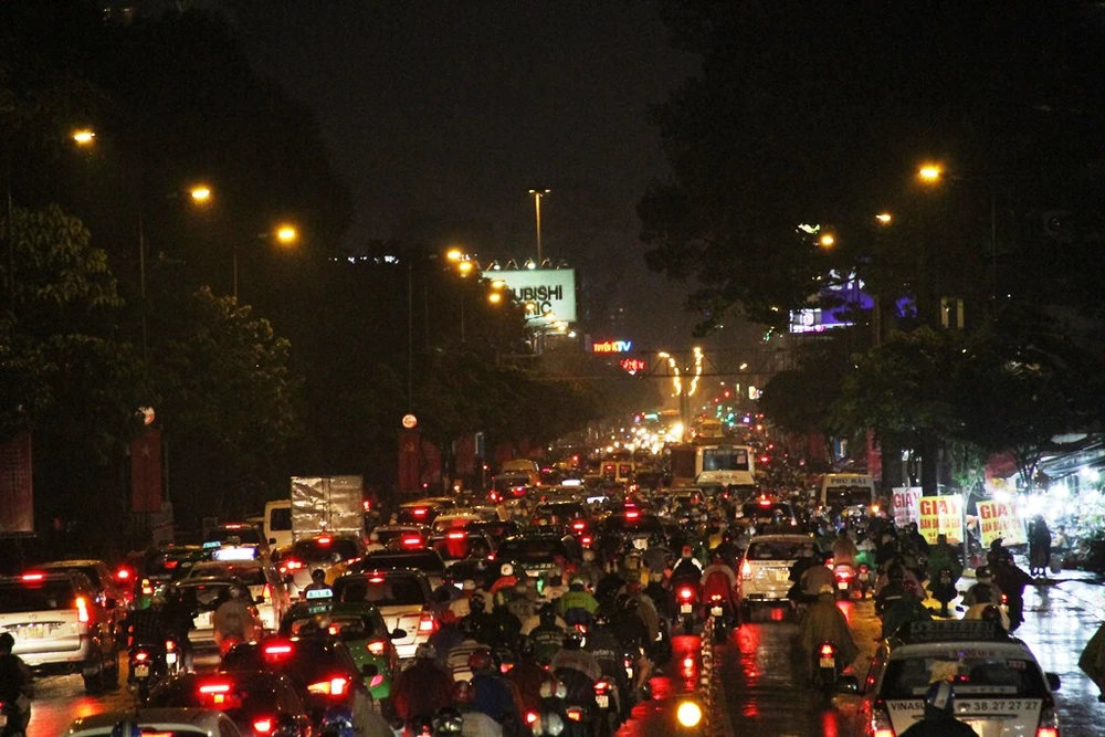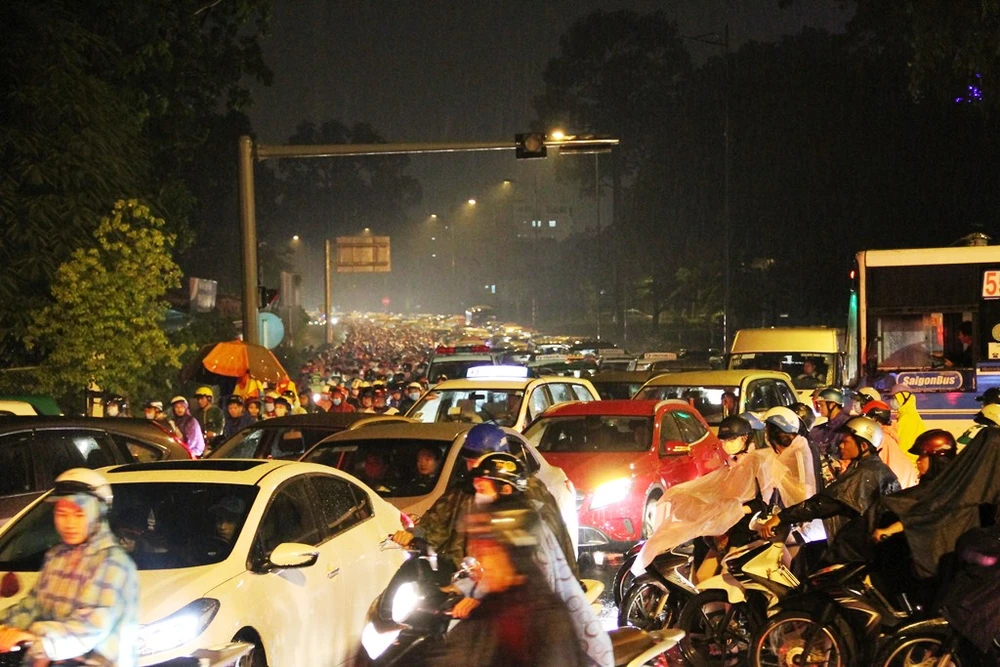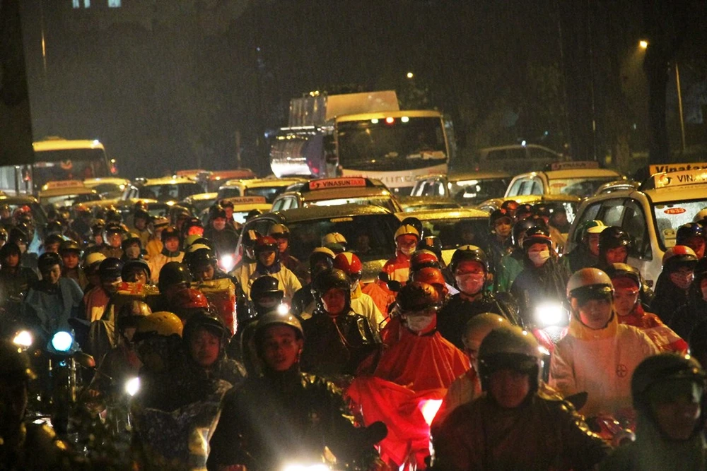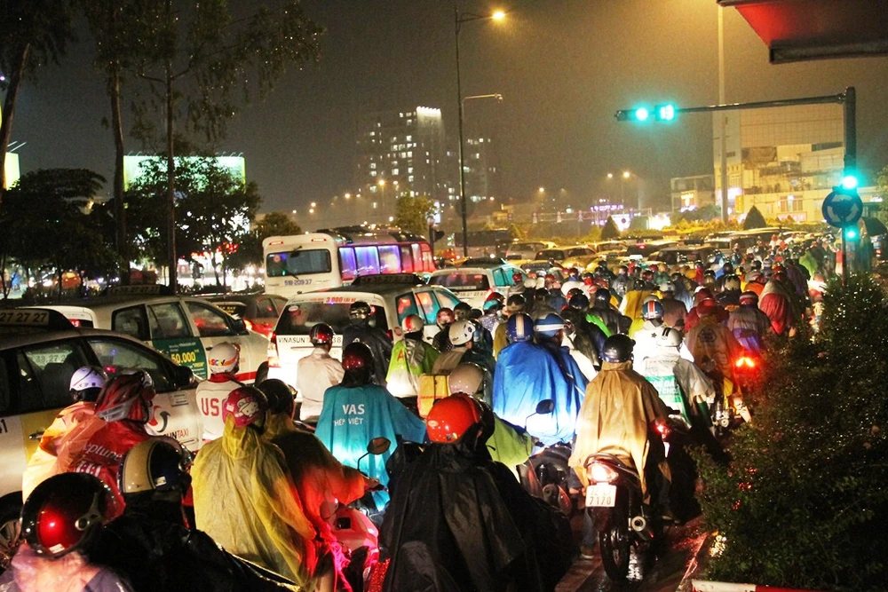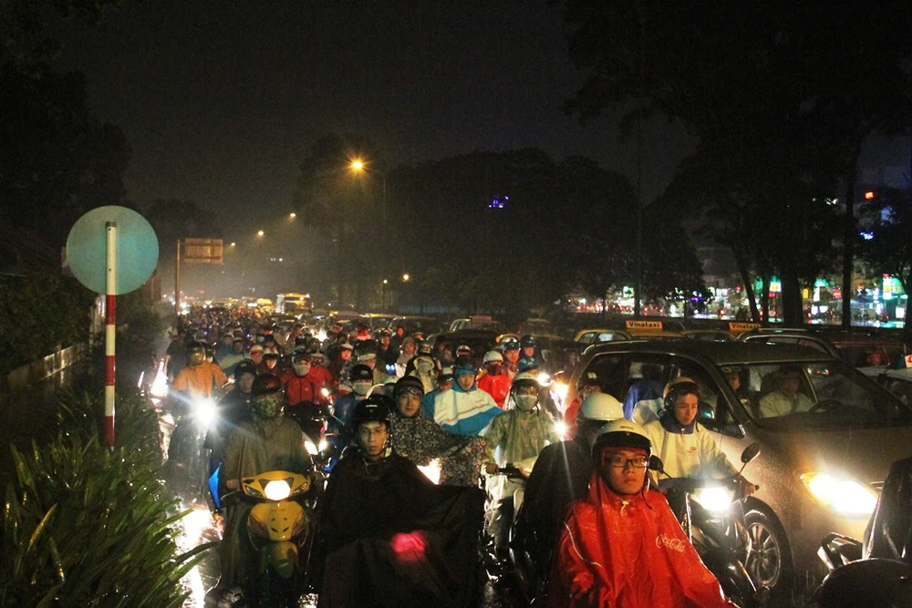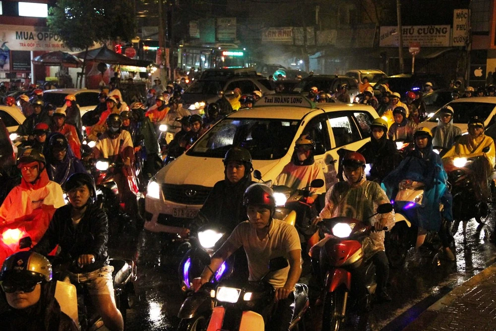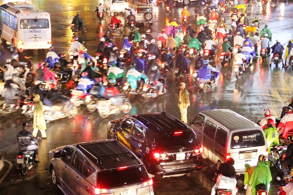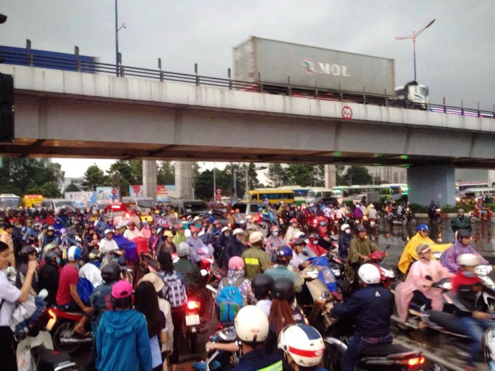 Kẹt xe bắt đầu từ cuối giờ chiều và kéo dài hàng chục phút trong trời mưa.