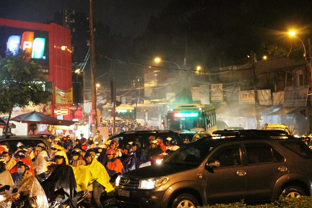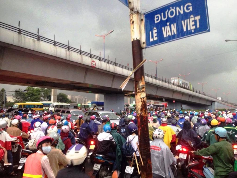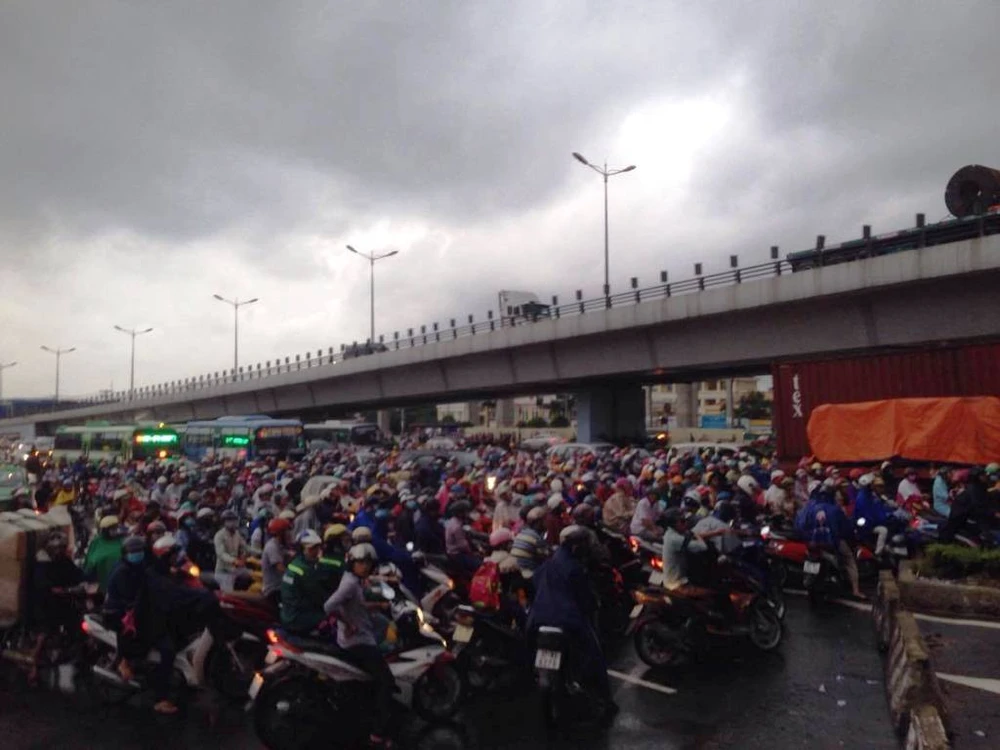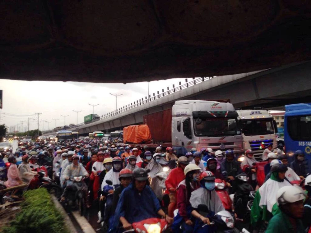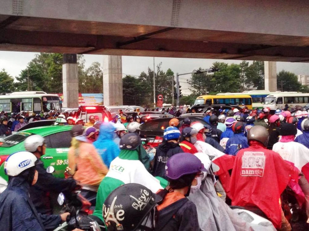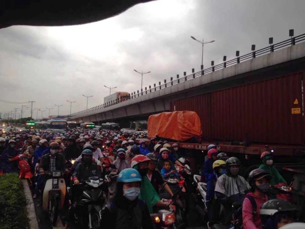 Cùng thời điểm, ngã tư Thủ Đức (giáp ranh giữa quận 9 và quận Thủ Đức) cũng kẹt cứng hàng ngàn phương tiện.