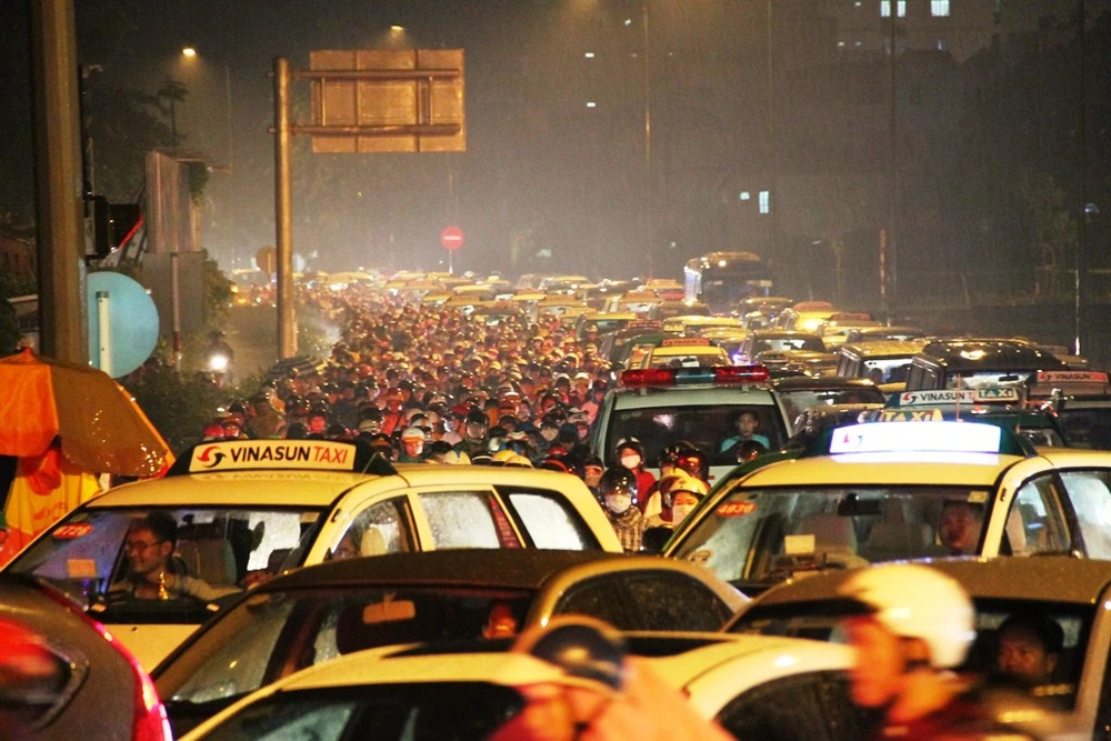 Hướng từ cầu vượt Lăng Cha Cả về đường Trường Chinh cũng kẹt cứng. Lực lượng CSGT khá vất vả phân luồng ở khu vực Lăng Cha Cả.