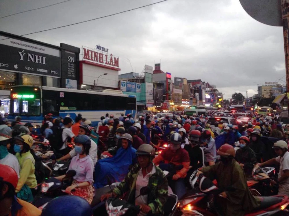 Hướng từ đường Nguyễn Kiệm hướng vào vòng xoay Nguyễn Thái Sơn cũng ùn ứ hàng ngàn phương tiện, phần đa là xe máy người dân tan tầm về nhà.