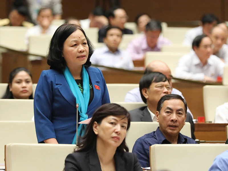 Đại biểu Nguyễn Thị Mai Hoa (Đồng Tháp) đặt vấn đề vì sao bất cập trong chi tiêu công chậm khắc phục, tiếp tục duy trì ở mức cao. Ảnh: V.LONG