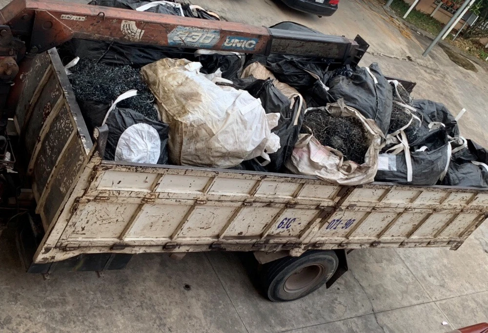 Qua kiểm tra, lực lượng chức năng phát hiện trên hai xe tải cẩu chở tổng cộng trên 21 tấn chất thải nguy hại gồm bụi kim loại từ quá trình sản suất và bazớ bằng sắt thép.