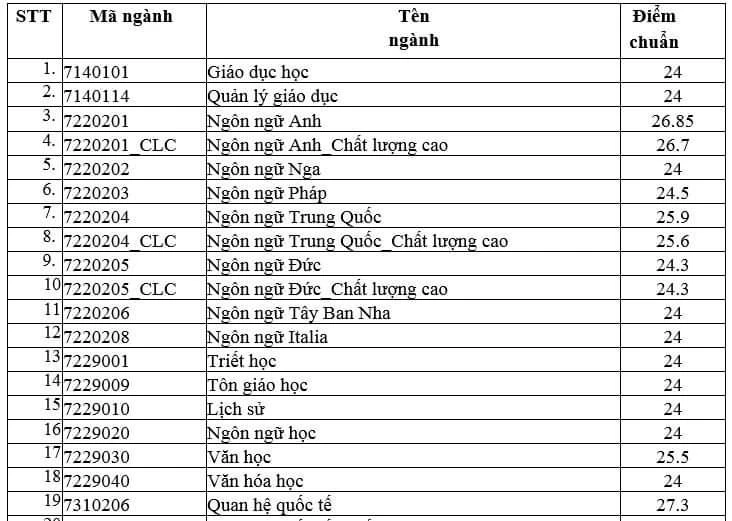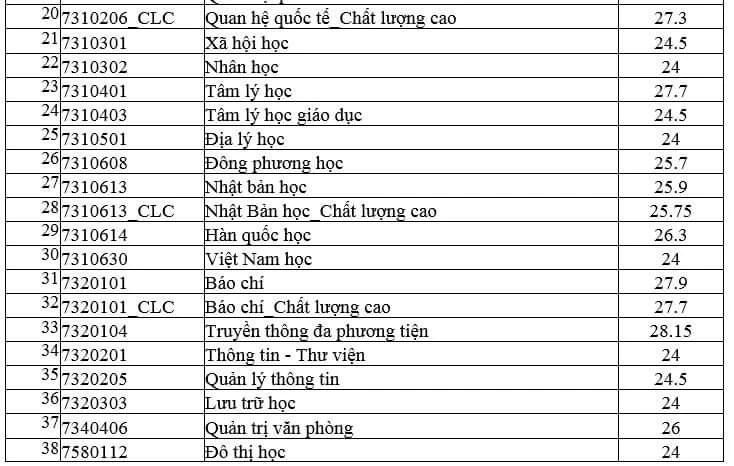 Trong đó, đứng top 10 là các ngành: Hàn Quốc học (26.3 điểm), Quản trị du lịch và lữ hành (26.85 điểm), Ngôn ngữ Anh (26.85 điểm), Ngôn ngữ Anh_Chất lượng cao (26.7 điểm), Quan hệ Quốc tế (hệ Chuẩn và hệ Chất lượng cao 27.3 điểm), Tâm lý học (27.7 điểm), Báo chí (27.9 điểm), Báo chí_Chất lượng cao (27.7 điểm), Truyền thông đa phương tiện (28.15 điểm).