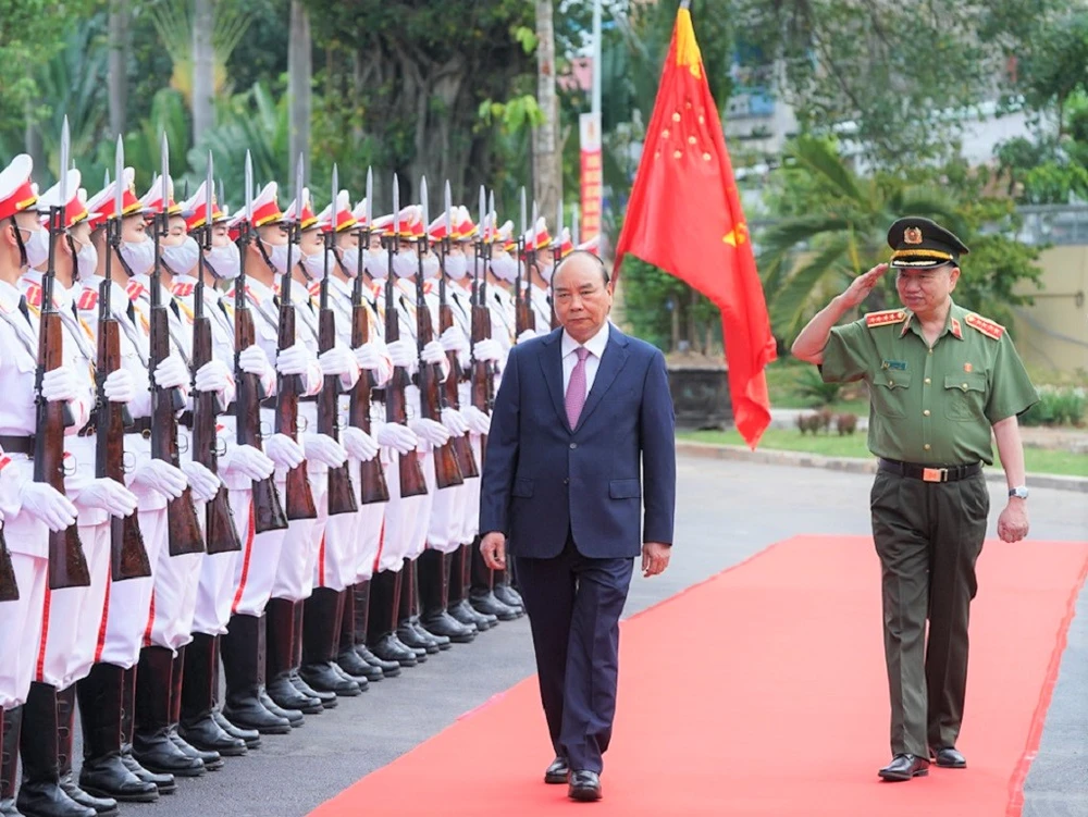 Thủ tướng Nguyễn Xuân Phúc (trái) cùng Bộ trưởng Tô Lâm tại Hội nghị Công an toàn quốc lần thứ 76. Ảnh: VGP
