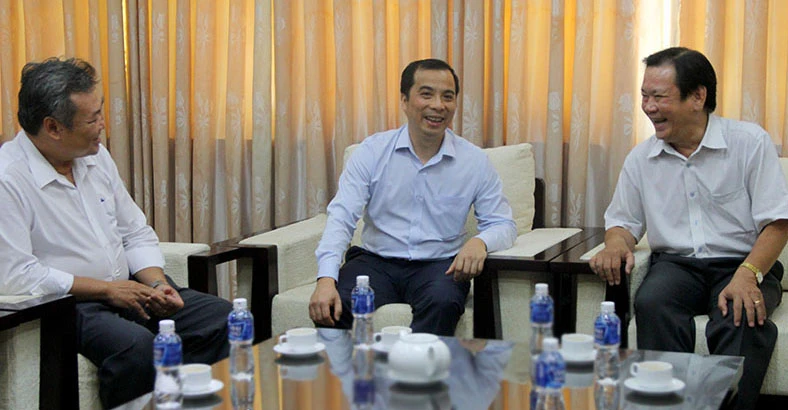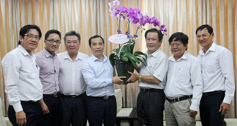 Đại diện Tập đoàn Điện lực Việt Nam, Tổng Công ty Điện lực TP.HCM chúc mừng ngày nhà báo Việt Nam tại báo Pháp Luật TP.HCM chiều 13-6. Ảnh: HOÀNG GIANG