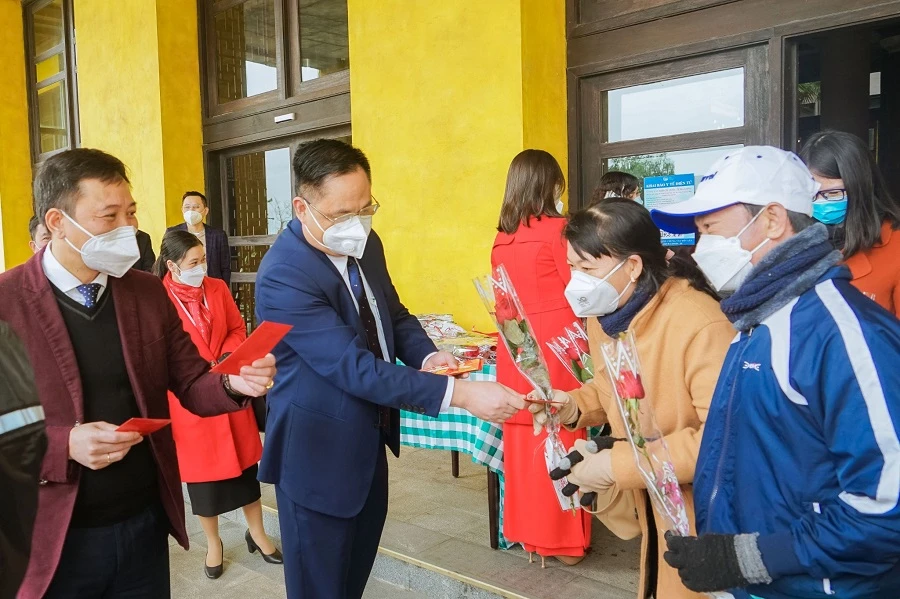 Du khách từ TP.HCM được lãnh đạo tỉnh Quảng Ninh và ngành du lịch Quảng Ninh lì xì đầu năm. ẢNH: L.THẢO