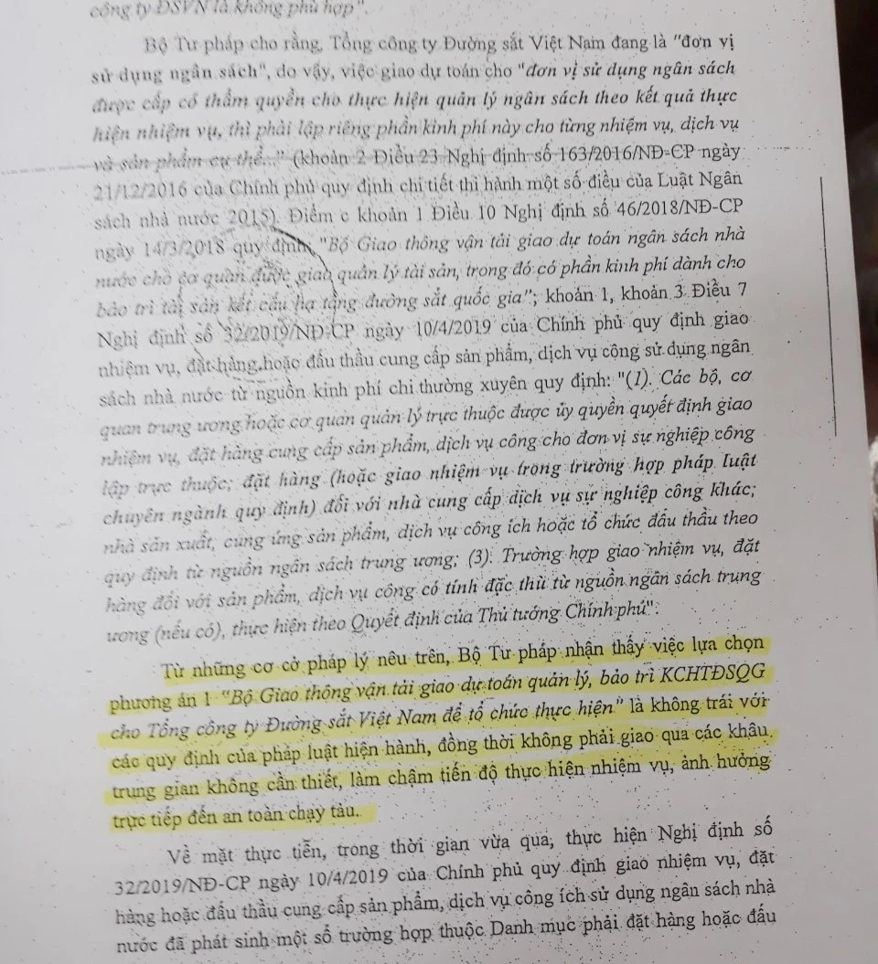 Cụ thể, Bộ Tư pháp cho rằng việc Bộ GTVT giao dự toán bảo trì cho VNR tổ chức thực hiện là không trái với quy định pháp luật hiện hành, đồng thời, không phải giao qua các khâu trung gian không cần thiết, làm chậm tiến độ thực hiện nhiệm vụ, ảnh hưởng trực tiếp đến an toàn chạy tàu.