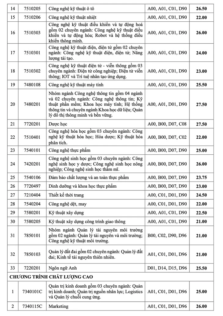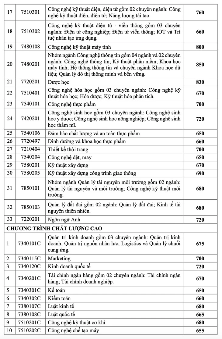 Ở phương thức xét học bạ, điểm trúng tuyển của 19 ngành theo hai mức. Mức 20 điểm theo tổ hợp ba môn gồm 5 ngành: quản lý đất đai, công nghệ thông tin, hệ thống thông tin, bất động sản và quản trị kinh doanh. Các ngành còn lại ở mức 18 điểm.