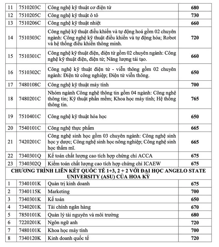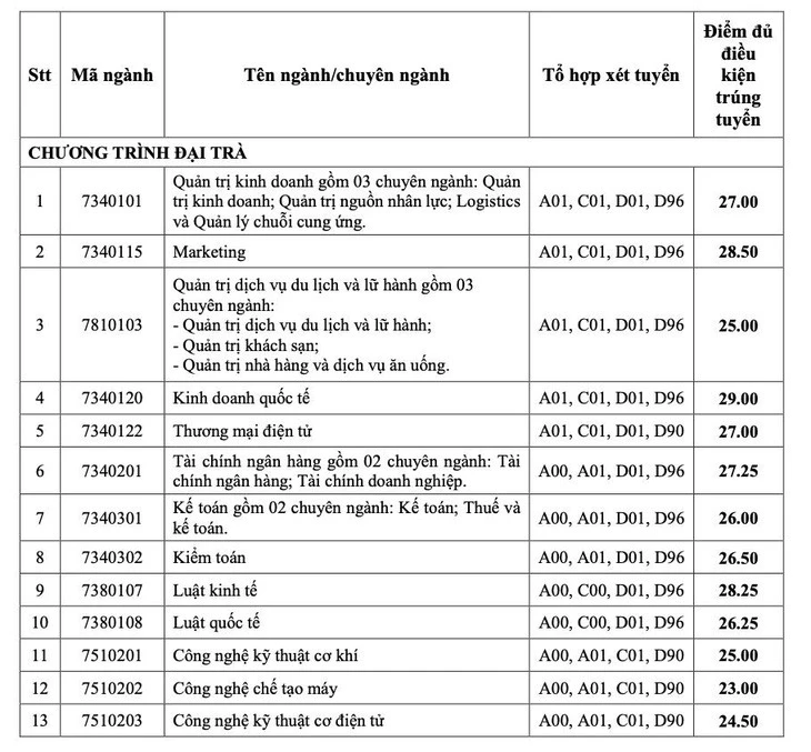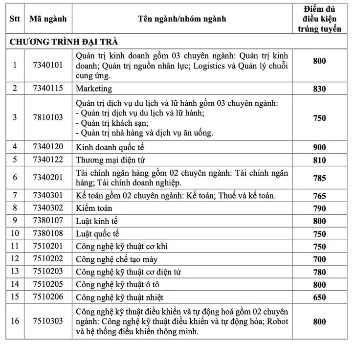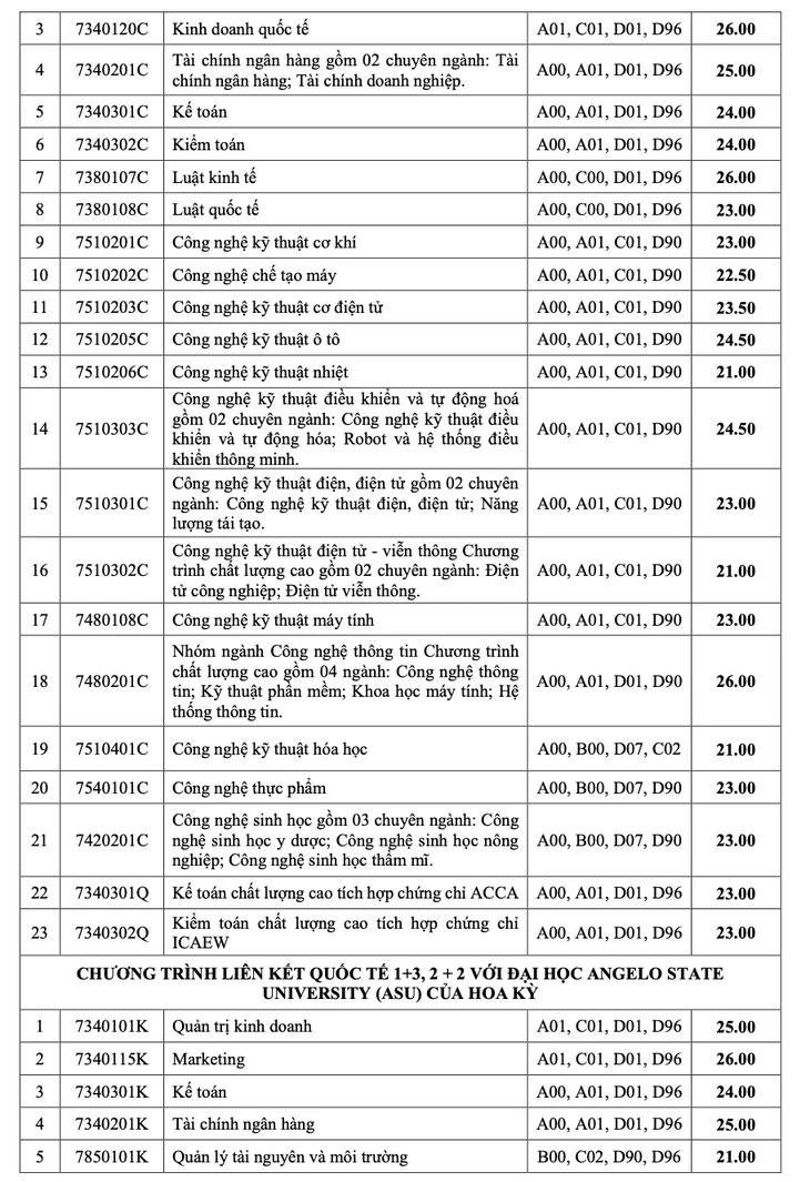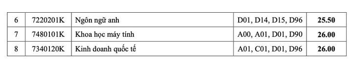 Đáng chú ý, Kinh doanh quốc tế là ngành có điểm chuẩn cao nhất ở hai phương thức xét học bạ THPT với 29 điểm và xét kết quả thi đánh giá năng lực Đại học Quốc gia TP.HCM với 900 điểm. Kế đến là Marketing với 28,5 điểm xét học bạ và 830 điểm đánh giá năng lực.