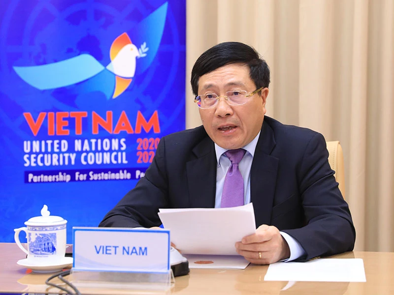 Phó Thủ tướng, Bộ trưởng Ngoại giao Phạm Bình Minh phát biểu tại cuộc họp trực tuyến của Hội đồng Bảo an Liên hợp quốc với chủ đề “Hợp tác giữa Liên Hợp Quốc và Liên minh châu Phi”. Ảnh: TTXVN