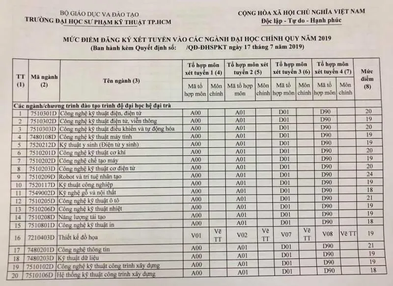 Chiều 17-7, Trường ĐH Sư phạm Kỹ thuật TP.HCM đã chính thức công bố ngưỡng điểm sàn theo tổ hợp kết quả thi THPT quốc gia vào các ngành học của trường.