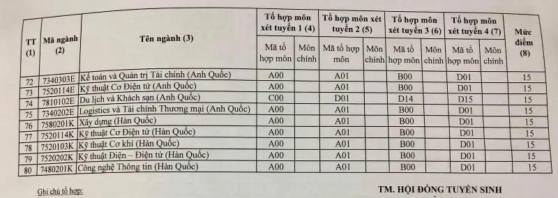 Theo đó, mức điểm sẽ từ 15 đến 24 điểm. Trong đó, ngành mới mở năm nay là Robot và Trí tuệ nhân tạo có điểm sàn cao nhất là 24 điểm. Kế đến là các ngành như Công nghệ thông tin, công nghệ kỹ thuật ô tô với 21 điểm.