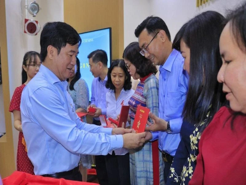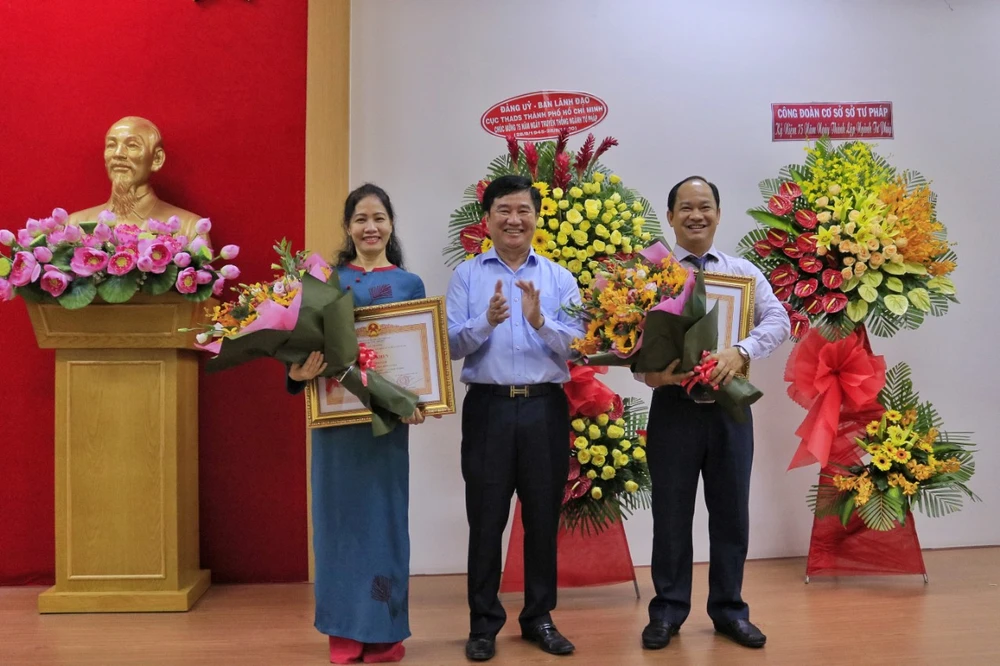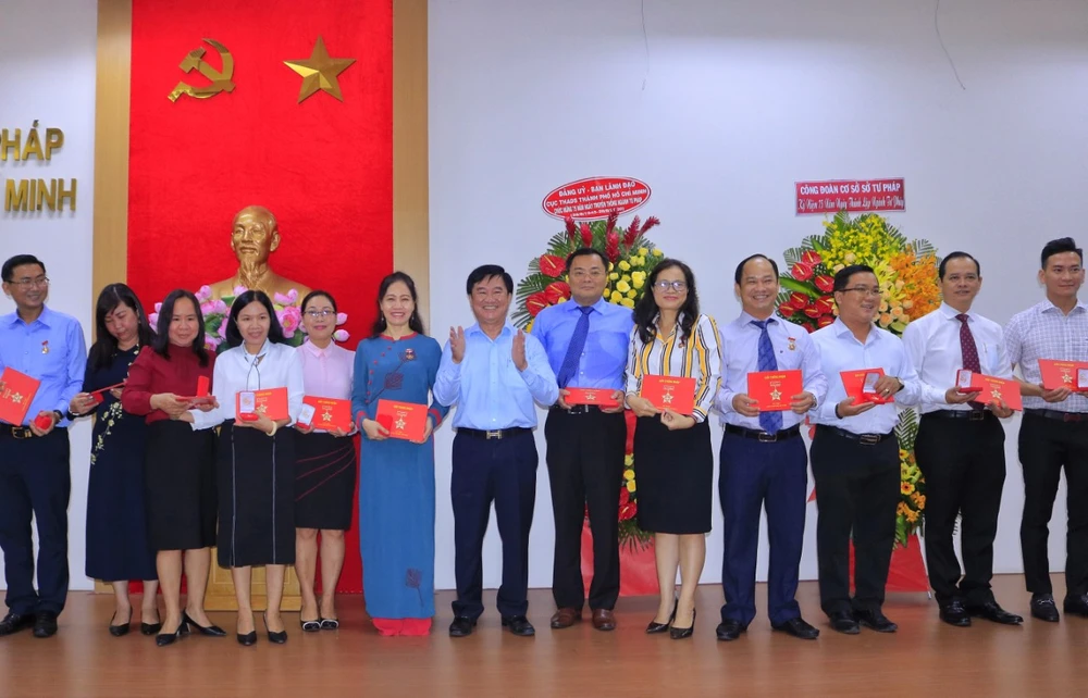 Các cá nhân xuất sắc của Sở Tư pháp TP.HCM nhận huy hiệu TP.HCM của UBND TP.HCM. Ảnh: NGUYỆT NHI