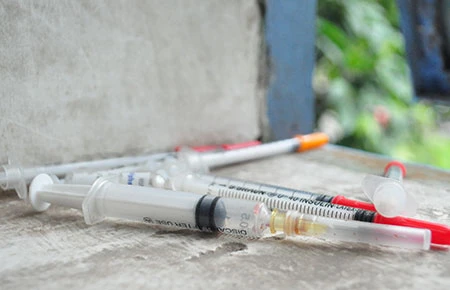 Bơm kim tiêm đầy trong nhà vệ sinh của một BV quận. Ảnh: TÙNG SƠN